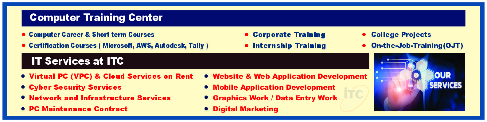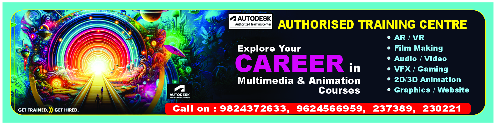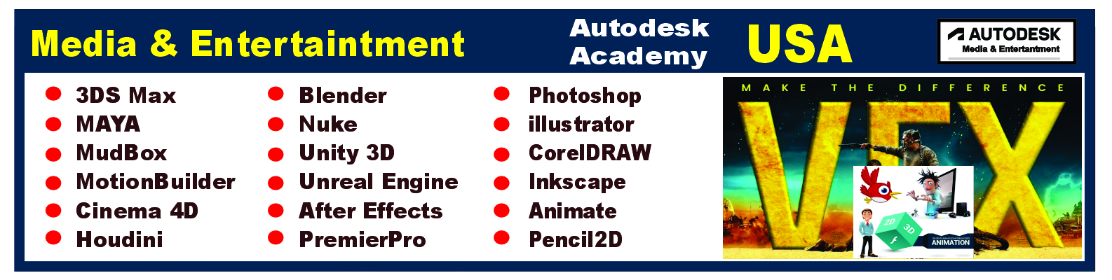 Professional Digital Graphics, Website Designing-UX-UI, 2D and 3D Animation, Audio-Video Editing, Social Media Marketing Post, VFX, AR/VR Applications, Multimedia Studio Exposure, Photography, Game Designing & Development, Digital Film Making.